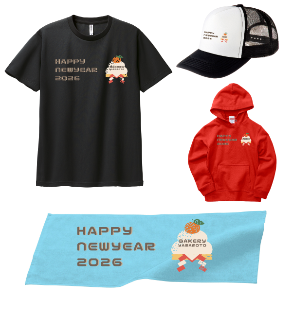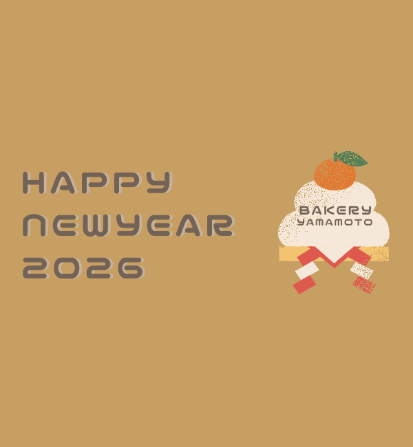 左側に鏡もちを配置し、「BAKERY YAMAMOTO」をその中央に配置してください。(ブラウン系)