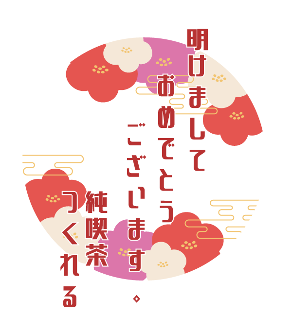 文字は縦書きで「明けましておめでとうございます。純喫茶つくれる」に変更し、書体はレトロな雰囲気のあるものでボルドー系の色にしてください。