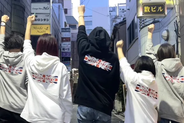 全員が背中を見せて拳を突き上げるポーズに統一感があり、街の背景とのコントラストが映画のワンシーンみたいで本当にカッコいいでお写真です。